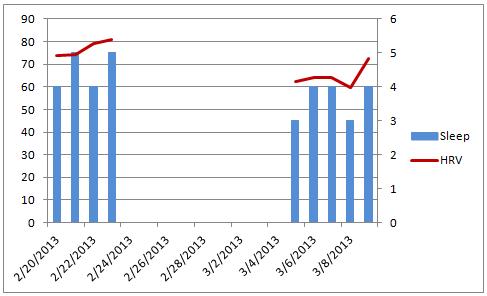 It is quite clear that his ability to resume his daily routine is compromised. For his first week back from vacation, I reduced the volume and intensity of his workouts and changed his conditioning work from highly anaerobic/interval based to much more moderate and aerobic based. Even though training loads were reduced, the workouts were still a bit of a struggle to get through for him. We can also see that his perceived sleep quality is also down.