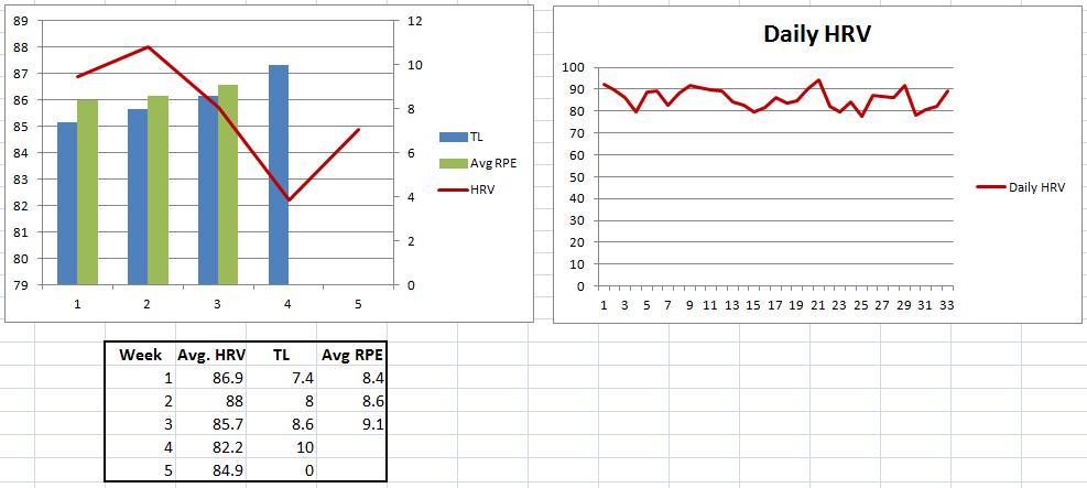 – – 3.5 change in HRV this week down to 82.2. This is consistent with his competition cycle where HRV reached lowest values the week of competition. However, we deloaded after week 3 of his competition prep which allowed HRV to recover and peak going in to competition. In this case, due to time constraints, we tested before the deload. It’s possible he may have been stronger with a proper deload before testing.