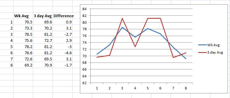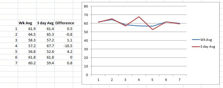 Last March, I posted some data that assessed the trends of daily vs. once per week and twice per week HRV recordings here. Today I’d like to revisit this topic. However, in this post I will be comparing weekly mean values to 3 day/week values. In the study mentioned above by Plews et al., the 3 days were randomly selected and were compared with performance changes. I’ve elected to consistently use Mon-Wed-Fri recordings to assess how a more structured and consistent approach would work and compare to the weekly mean trend. Working with a team of athletes, it would be much easier to designate 3 specific week days as HRV recording days. However, which 3 days are selected should likely depend on the training/competition schedule. Selecting days that all fall after intense training/competition may skew the results and not sufficiently reflect the recovery seen on days after lower intensity or rest days.
