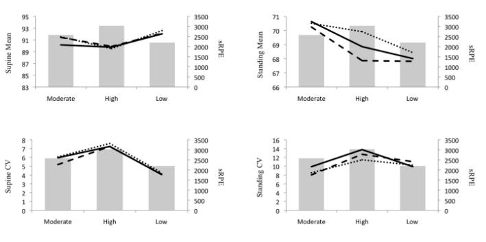 The weekly mean and CV for HRV in both standing and supine measures was determined first intra-individually and then averaged as a group. This was also done for sRPE and Wellness values.