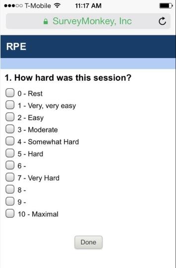 Training load was quantified via sRPE which was acquired between 15-30-min following all resistance training, conditioning and soccer practice sessions via email (SurveyMonkey) delivered to each athletes smartphone.