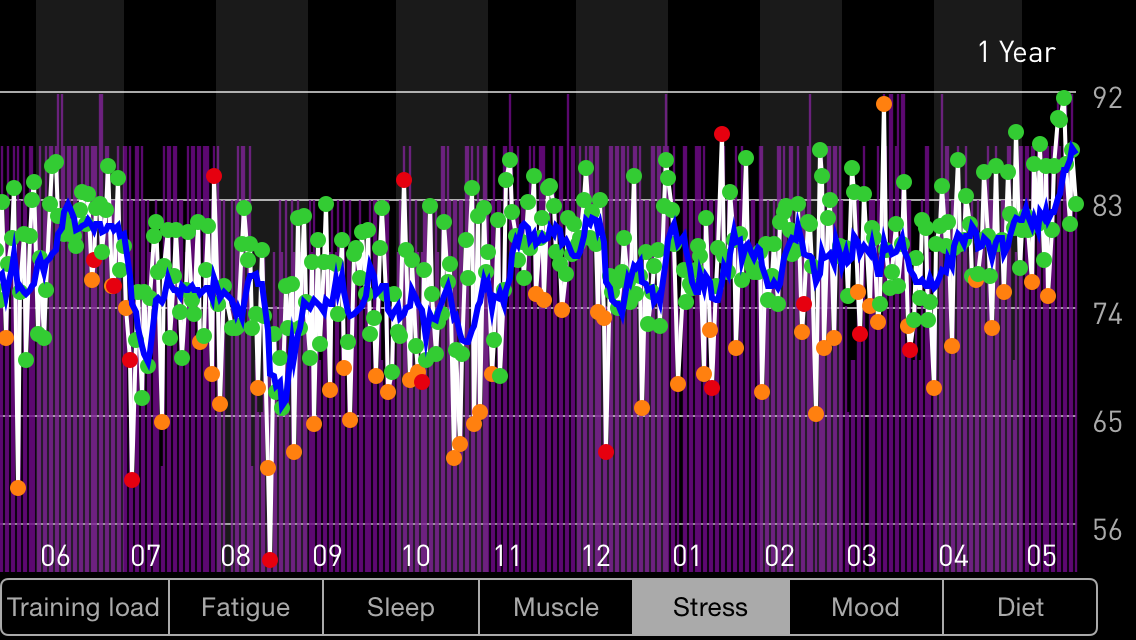 Below is my HRV trend following my first year of working on my PhD. Training was held pretty much constant throughout this time period (lift 4x/week, moderate aerobic work 2-3x/week). Both my first and second semester were equally as busy, however my perception of stress and my HRV trend was much lower and higher, respectively, in semester 2. The first few weeks of the first semester were so bad I was sick for over a week with the flu, which rarely happens to me (occurring at the lowest dip, early in the trend).