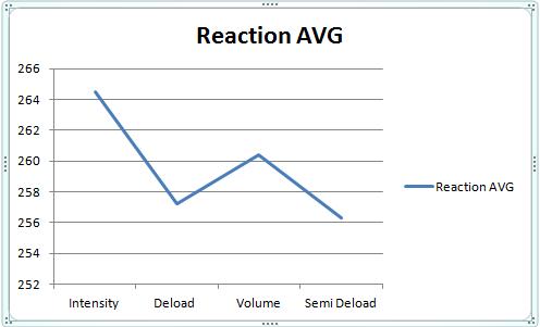 For a much more elaborate discussion on this experiment you can see the original post here. Essentially what I found was that Reaction test average and HRV average mirrored each other at each training period. HRV decreased and Reaction time increased (slower) during High Intensity and again during High Volume training reflecting fatigue. During reduced training loads HRV increased and Reaction time decreased (faster).